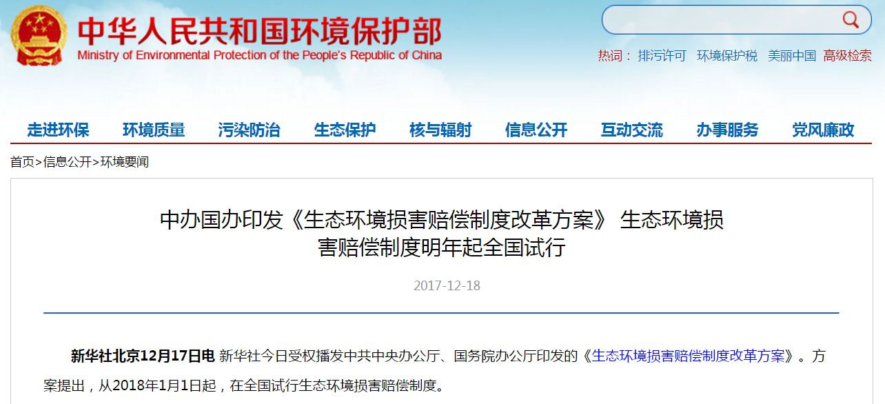 《改革方案》規(guī)定,從2018年1月1日起在全國(guó)試行生態(tài)環(huán)境損害賠償制度。