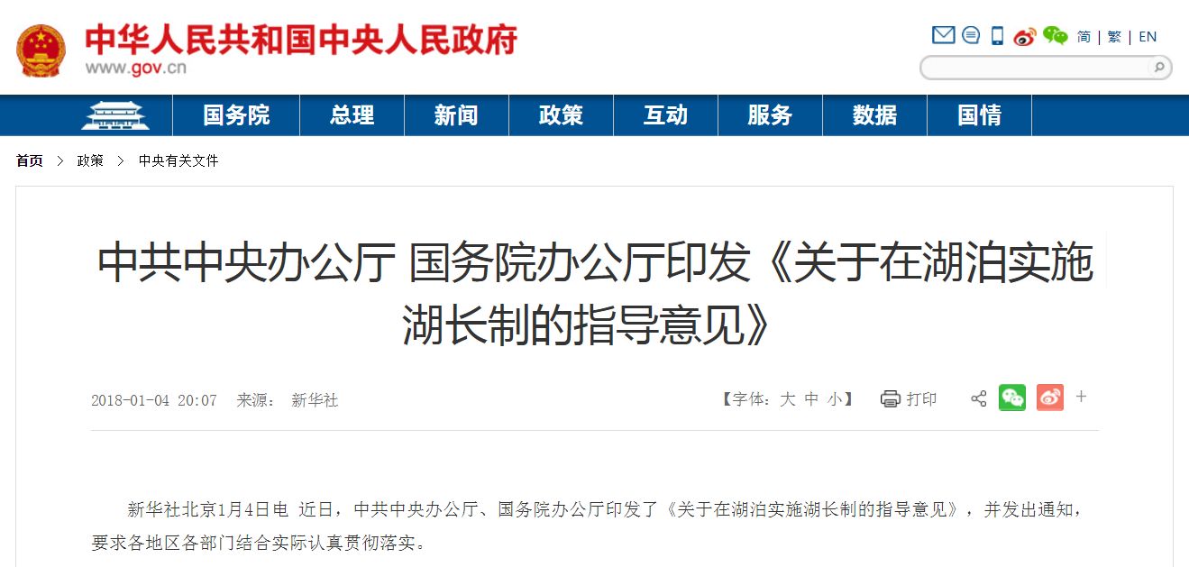 1月4日,在“河長(zhǎng)制”推出一年后,中辦、國(guó)辦印發(fā)了《關(guān)于在湖泊實(shí)施湖長(zhǎng)制的指導(dǎo)意見》,要求各地在2018年年底前全面建成湖長(zhǎng)制。