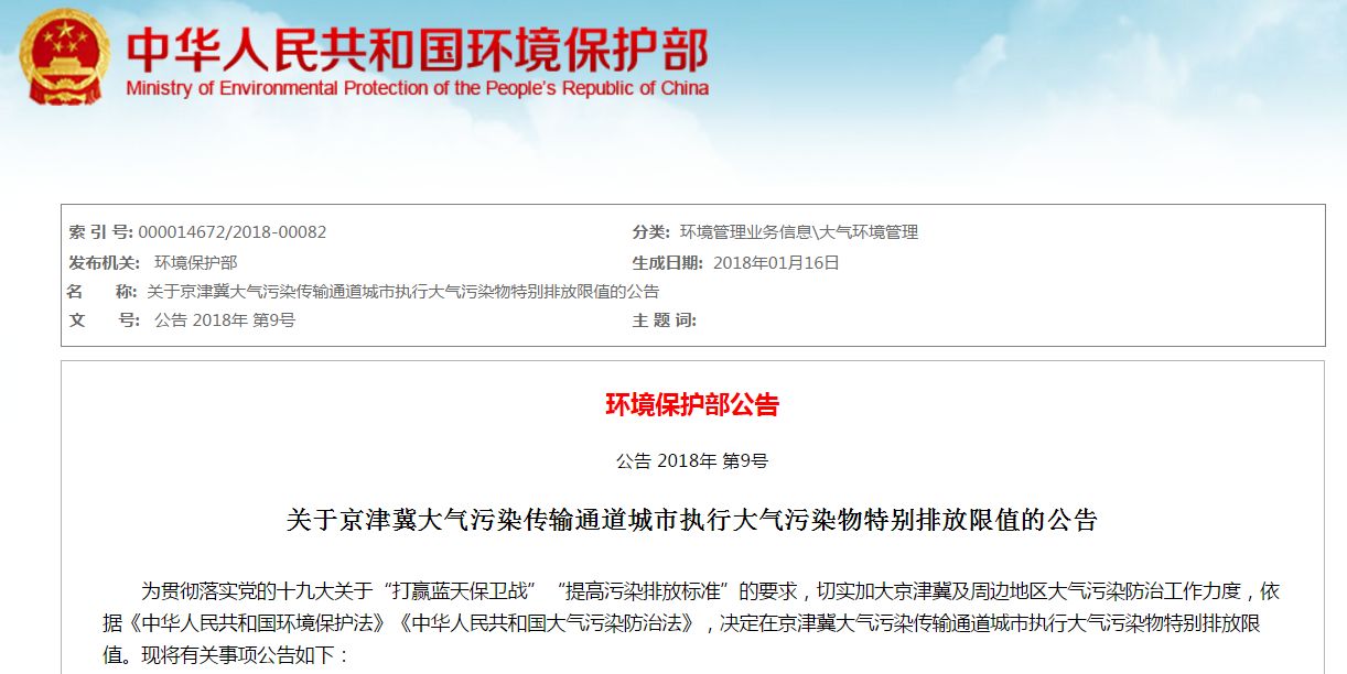 1月16日,環(huán)保部印發(fā)了《關(guān)于京津冀大氣污染傳輸通道城市執(zhí)行大氣污染物特別排放限值的公告》,要求京津冀大氣污染傳輸通道城市(“2+26”城市)將執(zhí)行大氣污染物特別排放限值。