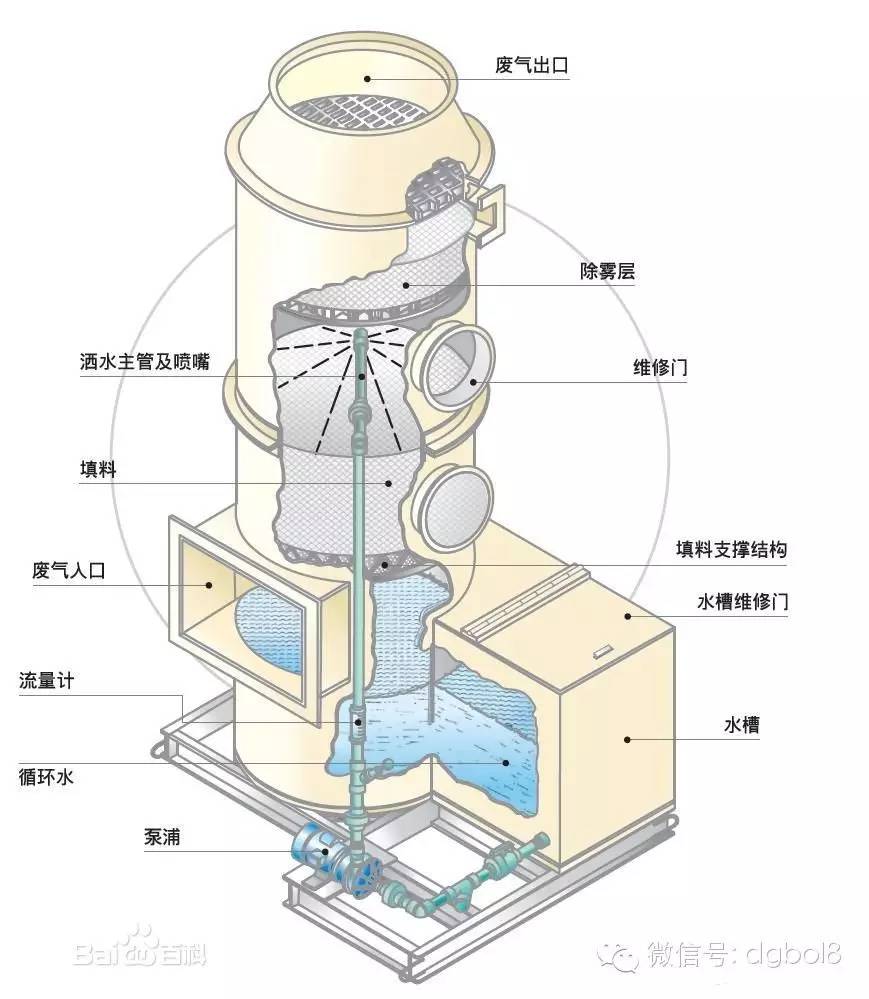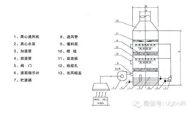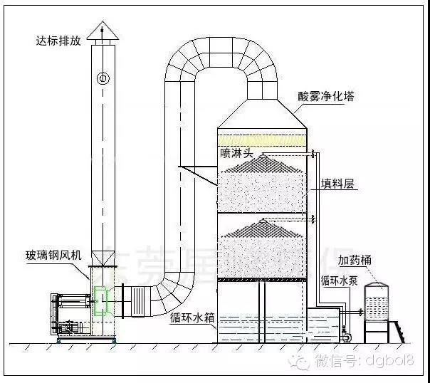 酸霧廢氣由風管引入凈化塔,經過填料層,廢氣與氫氧化鈉吸收液進行氣液兩相充分接觸吸收中和反應,酸霧廢氣經過凈化后,再經除霧板脫水除霧后由風機排入大氣。吸收液在塔底經水泵增壓后在塔頂噴淋而下,最后回流至塔底循環(huán)使用。凈化后的酸霧廢氣達到廣東省地方排放標準的排放要求,低于國家排放標準。