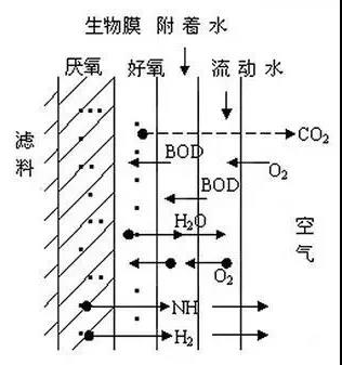 微生物在填料表面聚附著形成生物膜后,由于生物膜的吸附作用,其表面存在一層薄薄的水層,水層中的有機(jī)物已經(jīng)被生物膜氧化分解,故水層中的有機(jī)物濃度濃度比進(jìn)水要低得多,當(dāng)廢水從生物膜表面流過(guò)時(shí),有機(jī)物就會(huì)從運(yùn)動(dòng)著的廢水中轉(zhuǎn)移到附著在生物膜表面的水層中去,并進(jìn)一步被生物膜所吸附,同時(shí),空氣中的氧也經(jīng)過(guò)廢水而進(jìn)入生物膜水層并向內(nèi)部轉(zhuǎn)移。