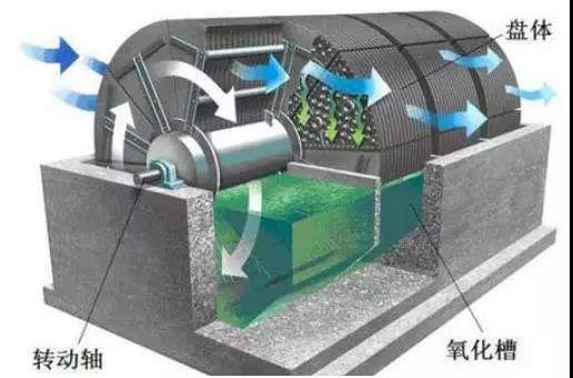 廢水從槽的一端流向另一端。盤(pán)軸高出水面,盤(pán)面約40%浸在水中,約60%暴露在空氣中。盤(pán)軸轉(zhuǎn)動(dòng)時(shí),盤(pán)面交替與廢水和空氣接觸。盤(pán)面為微生物生長(zhǎng)形成的膜狀物所覆蓋,生物膜交替地與廢水和空氣充分接觸,不斷地取得污染物和氧氣,凈化廢水。膜和盤(pán)面之間因轉(zhuǎn)動(dòng)而產(chǎn)生切應(yīng)力,隨著膜的厚度的增加而增大,到一定程度,膜從盤(pán)面脫落,隨水流走。