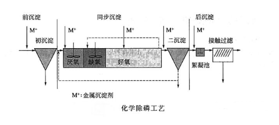 化學沉淀工藝是按沉淀藥劑的投加位置來區(qū)分的,實際中常采用的有:前沉淀、同步沉淀和后沉淀。