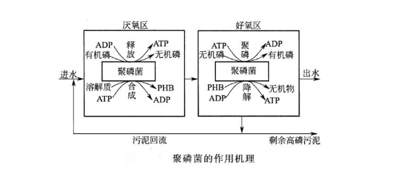 生物除磷的基本原理是利用一種被稱為聚磷菌(也稱為除磷菌、磷細菌等)的細菌在厭氧條件下能充分釋放其細胞體內的聚合磷酸鹽(該過程稱為厭氧釋磷);而在好氧條件下又能超過其生理需要從水中吸收磷 (該過程稱為好氧吸磷),并將其轉化為細胞體內的聚合磷酸鹽,從而形成富含磷的生物污泥,通過沉淀從系統(tǒng)中排出這種富磷污泥,達到從廢水中除磷的效果。聚磷菌的作用機理如圖所示。