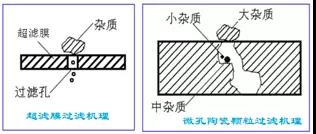 這是過濾截留原理示意圖,左圖表示超濾由固定孔徑機(jī)械截留,截留的雜質(zhì)在表面堆積,小于孔徑的雜質(zhì)會(huì)透過膜,液體的過濾路徑只有0.1微米。